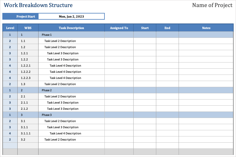 Bạn có columns đối với cấp độ, đánh số kiểu phác thảo, sau đó là tên hoặc mô tả nhiệm vụ. Enter người được giao, ngày bắt đầu và ngày kết thúc cũng như các ghi chú tùy chọn để có cấu trúc phân chia công việc đơn giản nhưng hiệu quả.