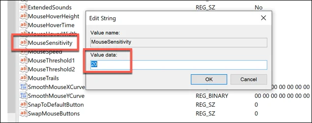 - Bạn sẽ thấy các mục đăng ký khác nhau cho cài đặt chuột của mình, nhưng một trong những mục quan trọng nhất là Độ nhạy của chuột mục nhập. Bấm đúp vào mục nhập để thay đổi giá trị thành bất kỳ con số nào lên đến 20.
