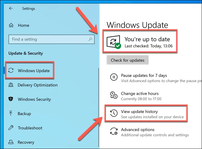 - Trong Cài đặt Windows, lựa chọn Cập nhật & Bảo mật> Windows Update. Nếu bất kỳ bản cập nhật nào đang được xử lý (hoặc nếu bản cập nhật không cập nhật được), những bản cập nhật này sẽ được liệt kê trong Cập nhật trạng thái phần. Bạn có thể kiểm tra trạng thái của các bản cập nhật trước đó bằng cách chọn Xem lịch sử cập nhật Lựa chọn.
