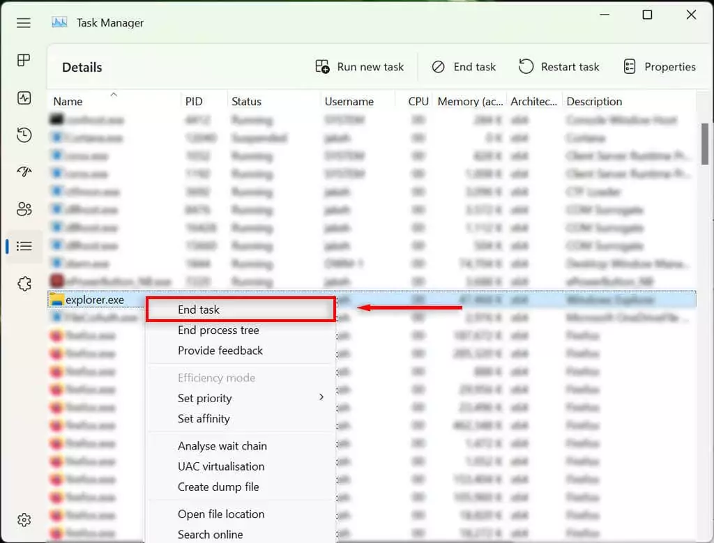 - Bấm chuột phải vào từng tác vụ và chọn Kết thúc nhiệm vụ. Tập trung vào các quy trình không phải của Windows để tránh gây ra các sự cố khác.