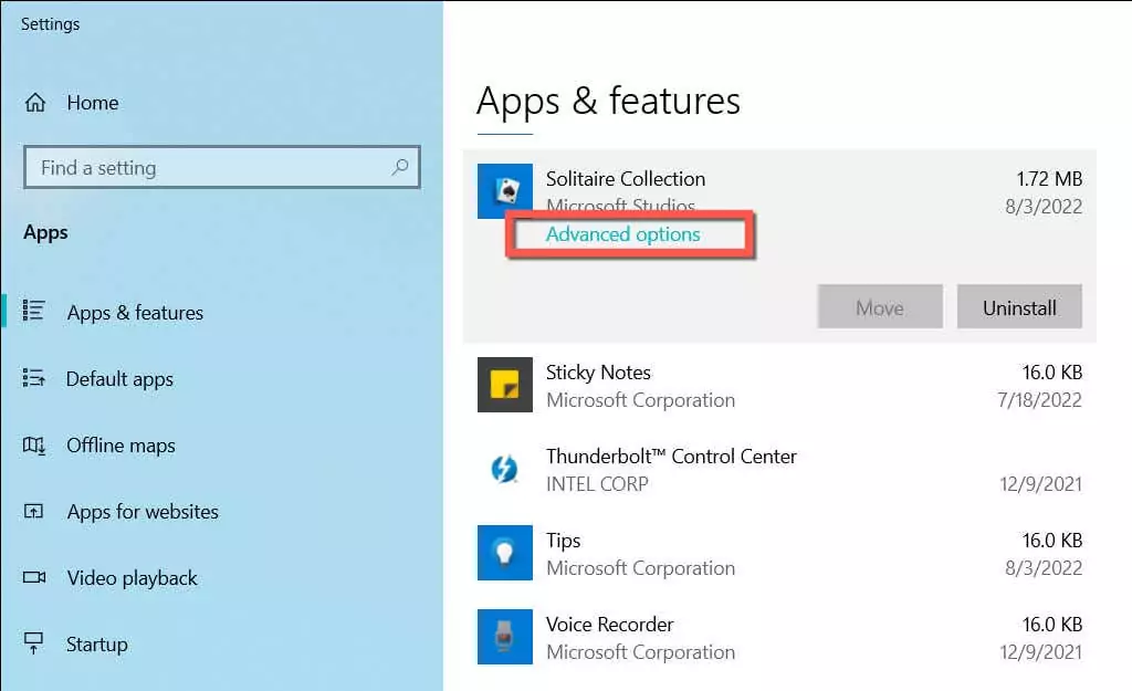 Cách nhanh nhất để khắc phục sự cố khởi chạy và các sự cố khác với Bộ sưu tập Solitaire là hoàn nguyên nó về cài đặt mặc định. Bạn có thể thực hiện điều đó thông qua ngăn Ứng dụng & Tính năng trên Windows Settings ứng dụng.