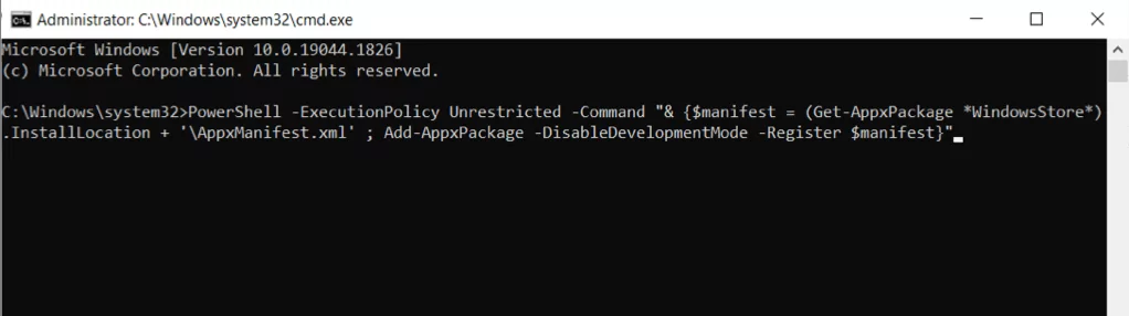 PowerShell -ExecutionPolicy Unrestricted -Command “& {$manifest = (Get-AppxPackage *WindowsStore*).InstallLocation + ‘AppxManifest.xml’ ; Add-AppxPackage -DisableDevelopmentMode -Đăng ký $manifest}”