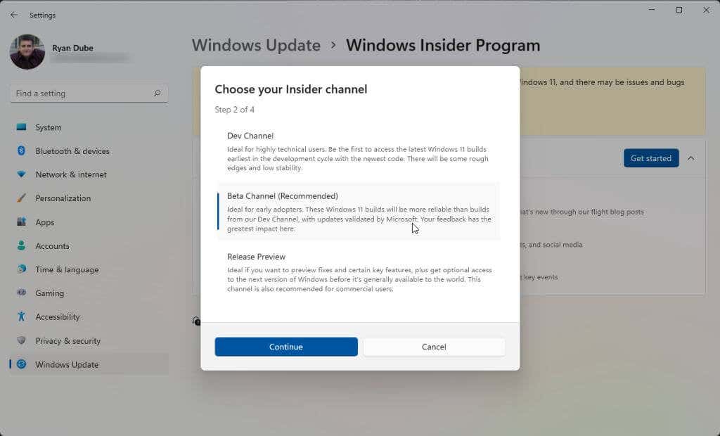 5. Sau khi đồng ý với các điều khoản của chương trình, bạn sẽ thấy ba kênh Người dùng nội bộ để lựa chọn. Để cài đặt Amazon Appstore, bạn sẽ muốn chọn Kênh thử nghiệm. Sau đó chọn Tiếp tục.