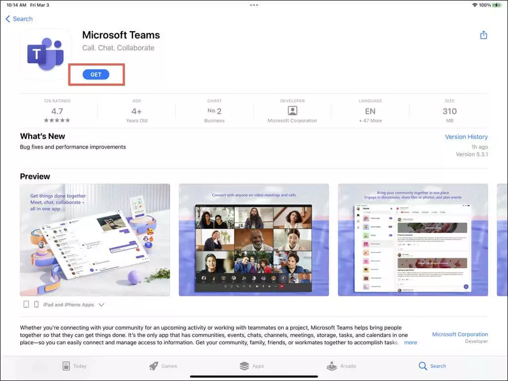 Microsoft cung cấp phiên bản Teams cho thiết bị iPadOS thông qua App Store của Apple. Để tải xuống và cài đặt nó trên iPad, bạn phải: