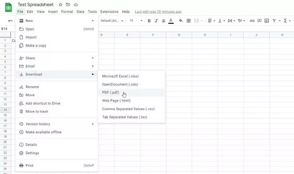Phương pháp dễ nhất để chuyển đổi bảng tính Google Trang tính trong tài khoản Google Drive của bạn sang định dạng PDF là sử dụng tùy chọn tải xuống tích hợp sẵn.