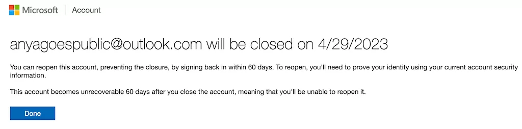 Sau khi hết 30 hoặc 60 ngày, bạn sẽ không còn quyền truy cập vào tài khoản Outlook của mình và bất kỳ dữ liệu nào bên trong tài khoản đó nữa.