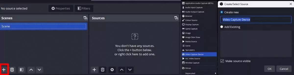 - Dưới Nguồn ở cuối màn hình, chọn + để thêm nguồn mới, sau đó chọn Thiết bị quay video.