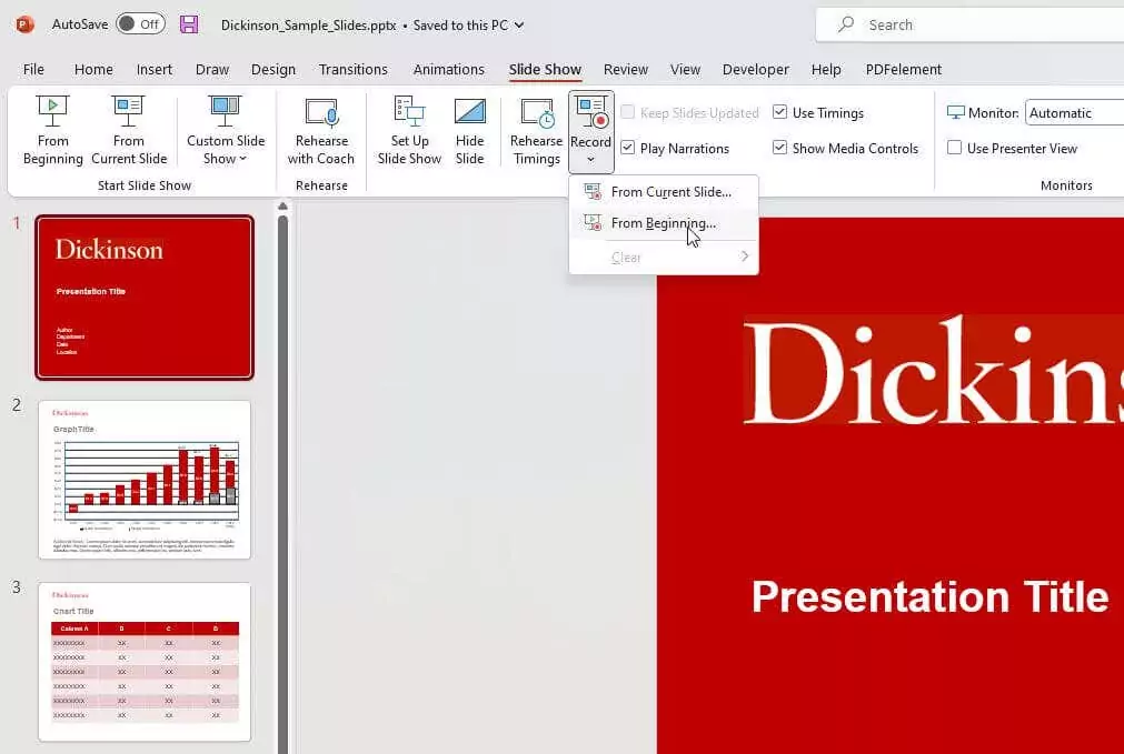 Sau đó, ghi lại bài thuyết trình của bạn bằng cách chọn Trình chiếu từ menu và chọn Ghi trong dải băng. Tiếp theo, chọn Từ lúc bắt đầu trong menu thả xuống để bắt đầu ghi bản trình bày của bạn ở chế độ toàn màn hình từ trang chiếu đầu tiên.