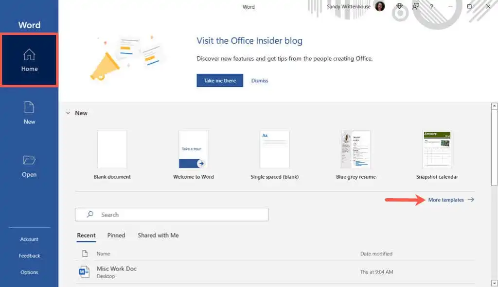 - Mở Microsoft Word trên Windows và chọn Nhà bên trái. Nếu bạn đã mở một tài liệu Word, hãy chọn Tập tin và sau đó Nhà.