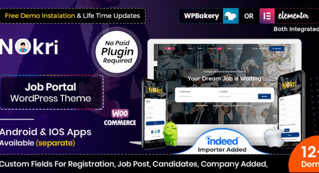 Nokri – Job Board WordPress Theme là một chủ đề WordPress bảng việc làm hoàn chỉnh được tải với các bảng riêng biệt dành cho nhà tuyển dụng và ứng viên. Bảng điều khiển có bộ lọc tìm kiếm thuận tiện, cả hai đều có thể quản lý và mọi thứ dễ dàng. Chủ đề Nokri WordPress có sẵn cả ứng dụng Android và IOS. Tải ứng dụng và đi trước đối thủ cạnh tranh của bạn một bước.